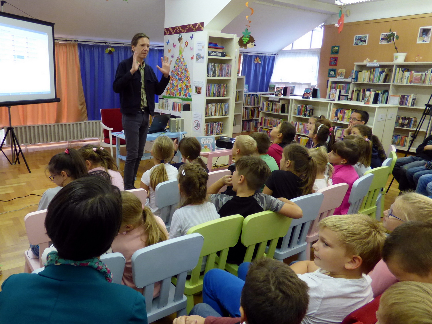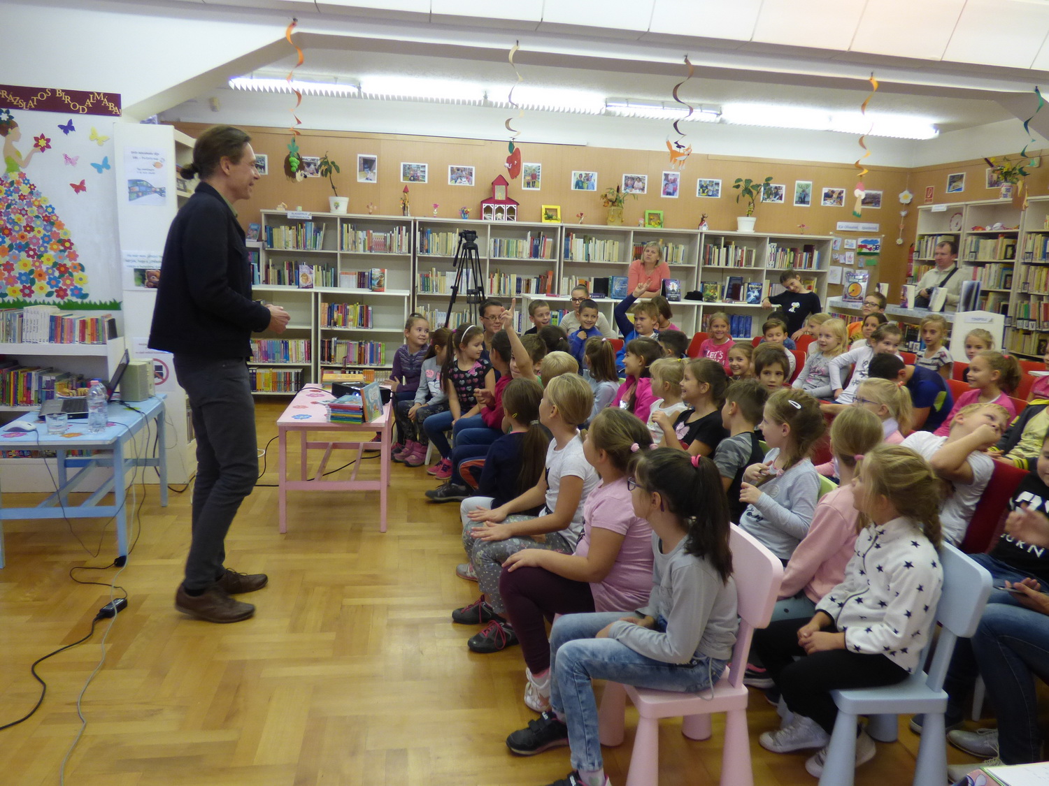 Az Országos Könyvtári Napok alkalmából, 2018. október 1-jén Dániel András író, illusztrátor látogatott el a gyermekkönyvtárba. A szerző a gyerekekkel való rövid ismerkedés után bemutatta kedvelt meseszereplőit, a kuflikat, majd felolvasott róluk két humoros történetet. A sok nevetéssel tarkított találkozónak a gyermekek is aktív részesei lehettek.