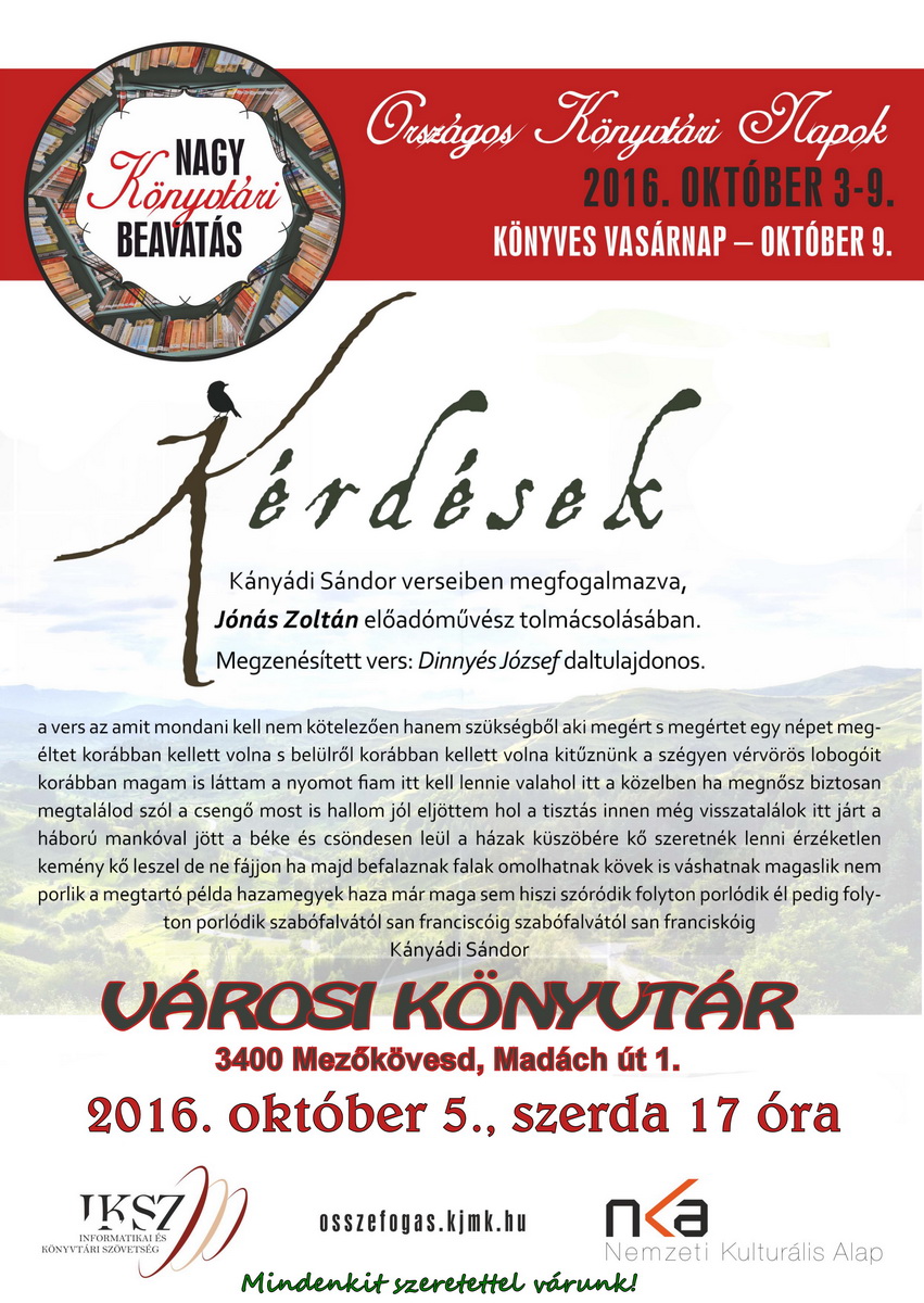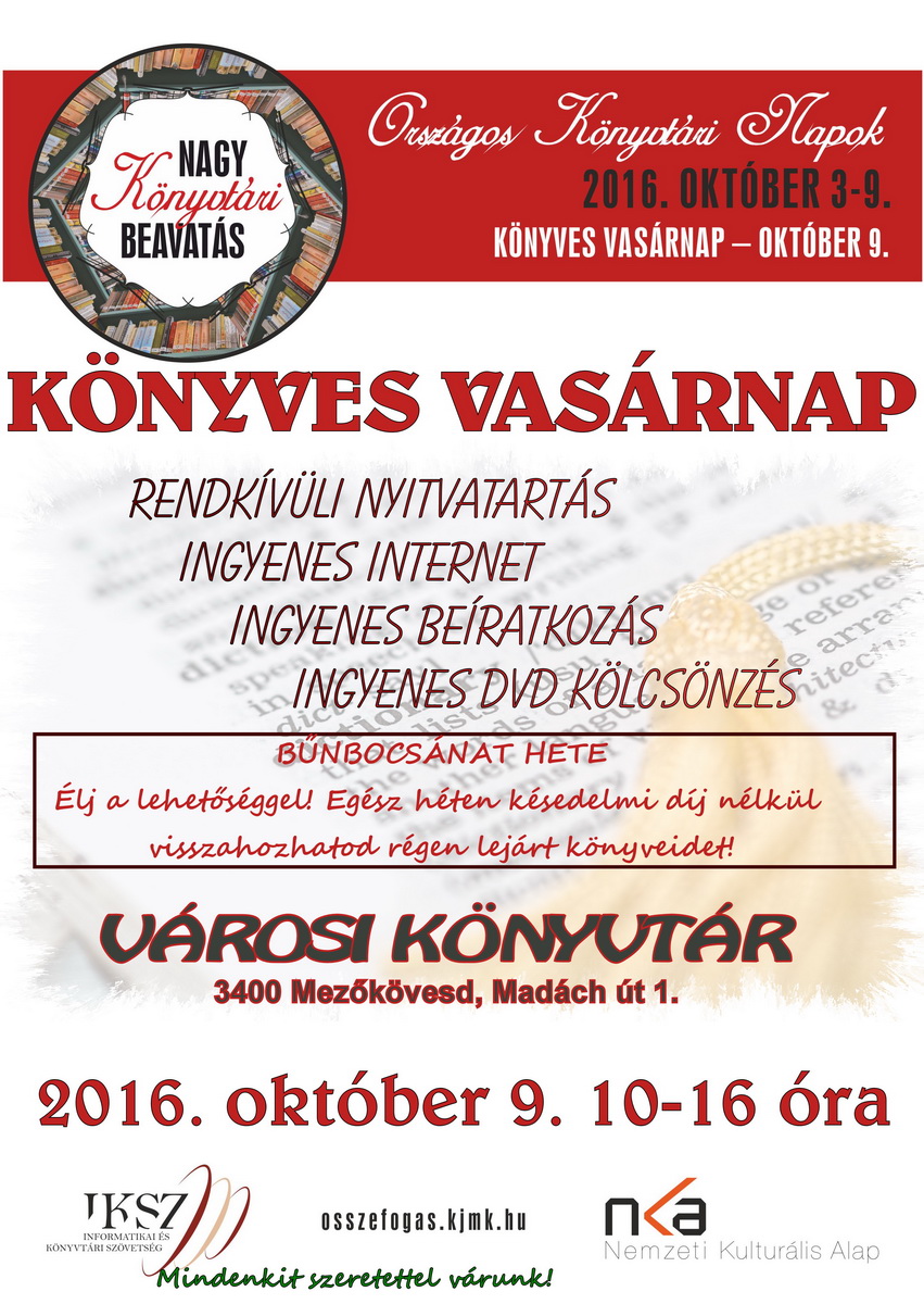 A Mezőkövesdi KÖZKINCS-TÁR Nonprofit Kft. Városi Könyvtára nevében sok szeretettel meghívjuk Önt és kedves partnerét rendezvényünkre