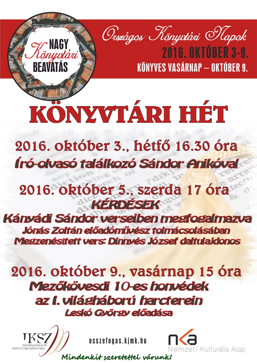 Az Országos Könyvtári Napok rendezvénysorozat első állomásaként Jónás Zoltán előadóművész idézte a „Hetek” költőnemzedék verseit, énekkel és gitárral Majoros Nikolett és Majoros Roland kísérte. Telt házas rendezvényünkön nemcsak az idősek, hanem a fiatalabb generáció tagjai is képviseltették magukat.